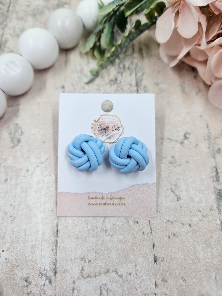 Chunky knot studs in soft blue polymer clay, twisted into a bold double-knot design. Lightweight yet eye-catching, these earrings make a playful statement while staying comfortable for everyday wear.