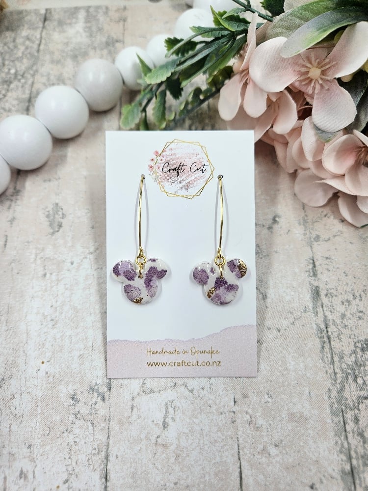 These handmade earrings feature a playful Mickey Mouse design, crafted from polymer clay in a striking red ochre hue adorned with a stylish leopard print.