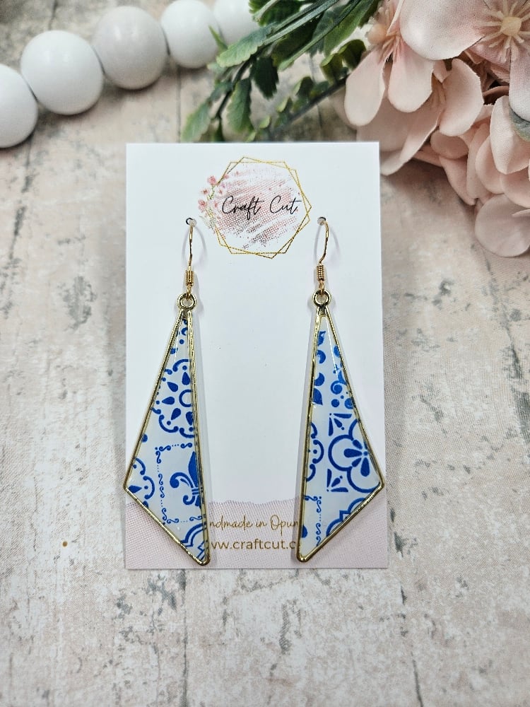 Mediterranean polymer clay earrings in a fun geometric shape, decorated with a blue and white tile design framed in yellow-gold. The crisp lines and detailed Mediterranean tile patterns give these earrings a fresh coastal feel, perfect for adding a touch of summer style.