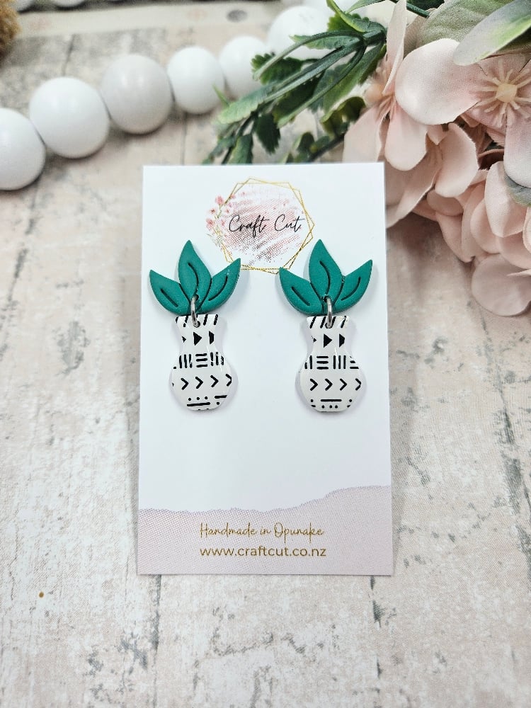 Polymer clay earrings featuring deep green layered leaves paired with round white pots patterned in bold black tribal-style markings. The mix of natural and geometric shapes gives these handmade earrings a modern boho feel, perfect for plant and pattern lovers alike.