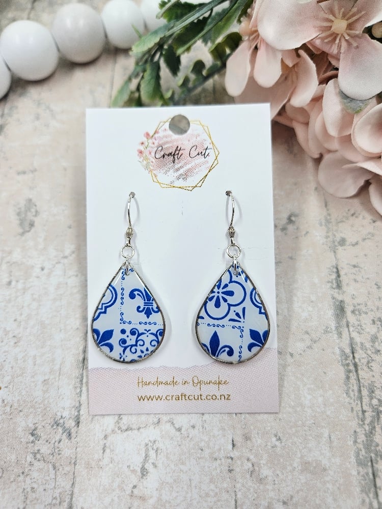 Polymer clay earrings in a teardrop shape, showcasing blue and white tile patterns with a silver frame and hook fitting. The crisp silver finish gives them a fresh, coastal feel, while the detailed Mediterranean tile design adds a bright, summery touch.