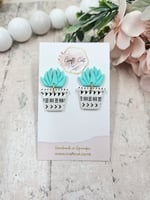Handcrafted polymer clay earrings featuring layered mint leaves and a bold black and white tribal pot design. Each pair brings a mix of modern style and Aztec-inspired detail, creating a fun statement for plant lovers and pattern fans alike.